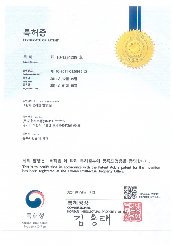 특허 제10-1354205 호 페이지 정보 작성자 대표 댓글 0건 조회 618회 작성일 21-10-06 11:07 인쇄 본문 이현 시스템의 "조립이 편리한 캡형 문" 에 관한 특허 입니다 목록 답변 이전글벤처 기업 확인서 21.10.06 다음글시험 성적서 21.10.06 댓글목록 댓글목록 등록된 댓글이 없습니다.