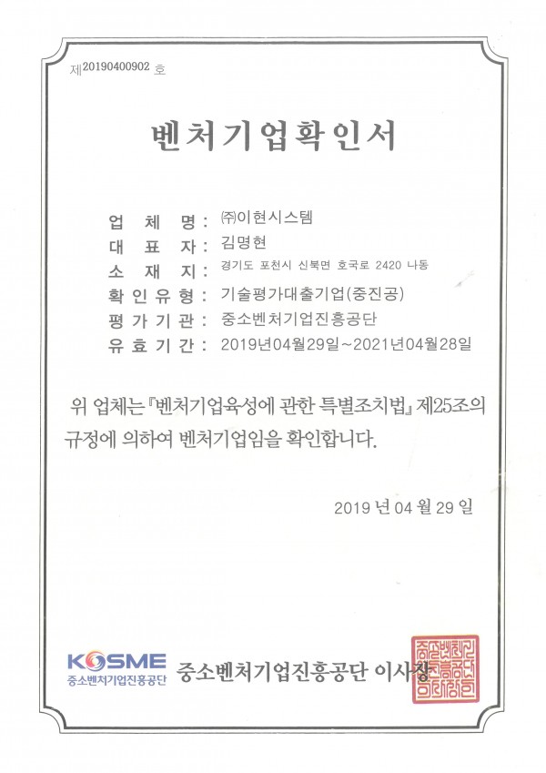 벤처 기업 확인서 페이지 정보 작성자 대표 댓글 0건 조회 556회 작성일 21-10-06 11:09 인쇄 본문 이현 시스템은 중소벤처기업진흥공단 으로 부터 2019년 벤처기업 으로 인증 받았습니다. 목록 답변 이전글특허 제10-2231729 호 21.10.06 다음글특허 제10-1354205 호 21.10.06 댓글목록 댓글목록 등록된 댓글이 없습니다.