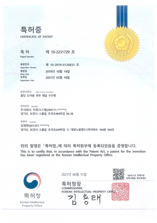 특허 제10-2231729 호 페이지 정보 작성자 대표 댓글 0건 조회 655회 작성일 21-10-06 11:12 인쇄 본문 이현시스템의 "폴딩 도어용 하부 레일 구조체" 에 관한 특허 입니다. 목록 답변 이전글특허 제10-2248359호 21.12.02 다음글벤처 기업 확인서 21.10.06 댓글목록 댓글목록 등록된 댓글이 없습니다.